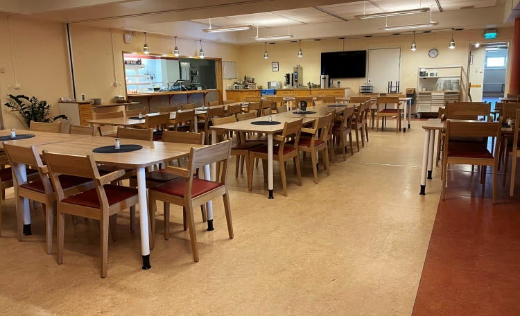 Det innebär bland annat att matsalen och köket har flyttat till vår ”nya” tillfälliga matsal i källaren på hus 11. Matsalen är nu i cafeterian utanför Baldursalen och köket har flyttat in i den tidigare cafeteriaserveringen. En del anpassningar har gjorts i utrymmet för att verksamheten ska kunna tillaga och servera till exempel frukost, fika och sallad. Eleverna får sin lunch och middag via catering från sjukhusets restaurang.