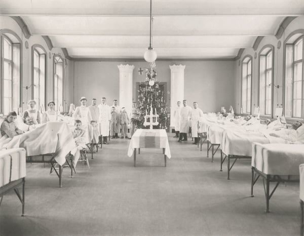 Månadens fotografi föreställer liggsalen för män på Gävle lasarett. Bilden är 120 år gammal men ändå kan man urskilja detaljer såsom yvigt kammade mustascher och doktor Lindström och doktor Landelius längst bak till vänster.