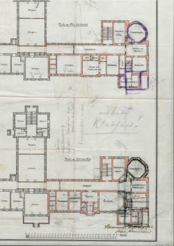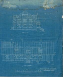 Ritningen visar den så kallade ”Röda gården” på Helsingegårdens lanthushållsskola i Järvsö. Skolans grundare och föreståndarinna var Agnes Sundberg, som våren 1918 tog över hemmanet Ol-Ols i Kåsjö. På den lite förfallna hälsingegården startade hon den lanthushållsskola hon länge drömt om att driva och utveckla. Gården bestod från början bara av en huvudbyggnad och en ladugård, och det var i huvudbyggnaden, kallad ”Vita gården”, som både undervisningen hölls och eleverna bodde under första kursen hösten 1918. Agnes och hennes första lärarinna Elsa Brunnström planerade tidigt för en utvidgning av verksamheten och år 1919 byggdes den stora ladugården om till elevhem och fick namnet ”Röda gården”.